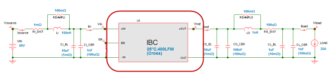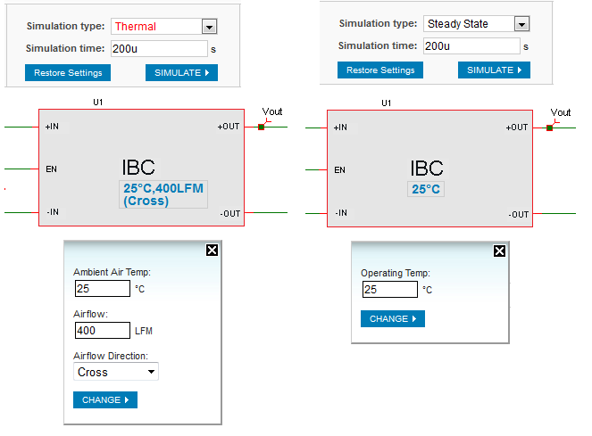 | Thermal | Simulates the electrical performance at steady state electrical conditions and with a user defined thermal environment; ambient air-temperature, airflow and airflow direction. | A table with power loss, efficiency and the predicted operating temperature of the unit. Also charts with input and output current and voltage waveforms. |