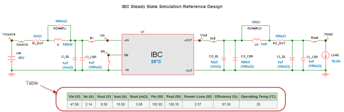| Steady-State | Simulates the electrical performance at steady state electrical conditions and at a user defined fixed operating temperature. | A table with power loss, efficiency etc. Also charts with input and output current and voltage waveforms. |