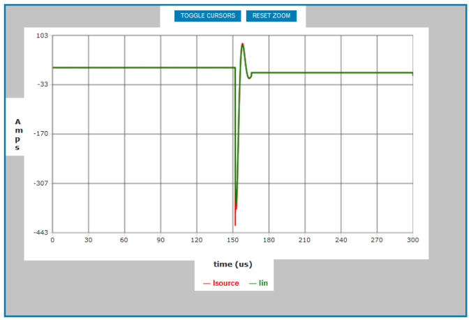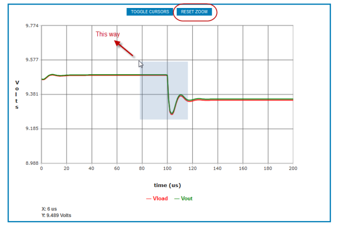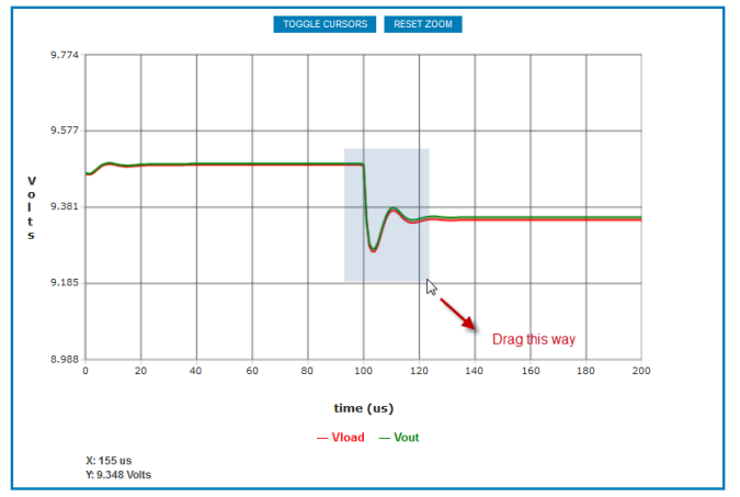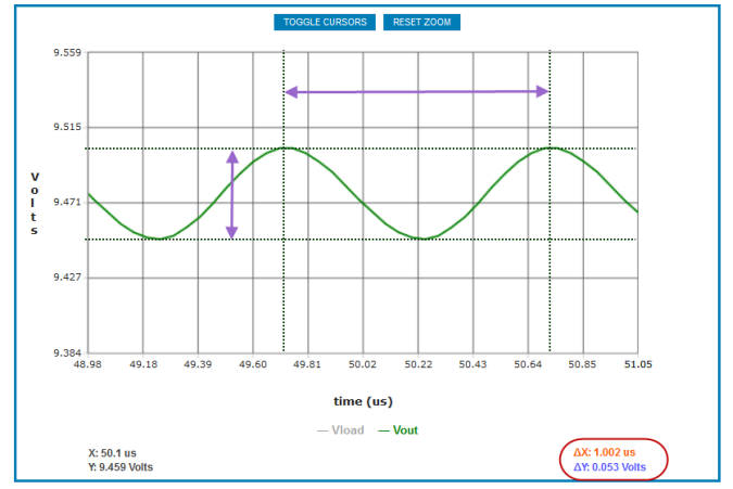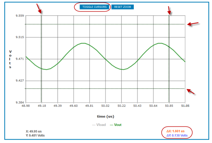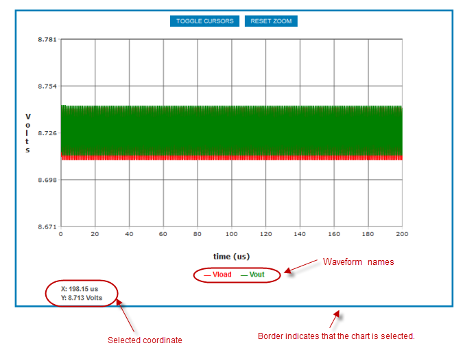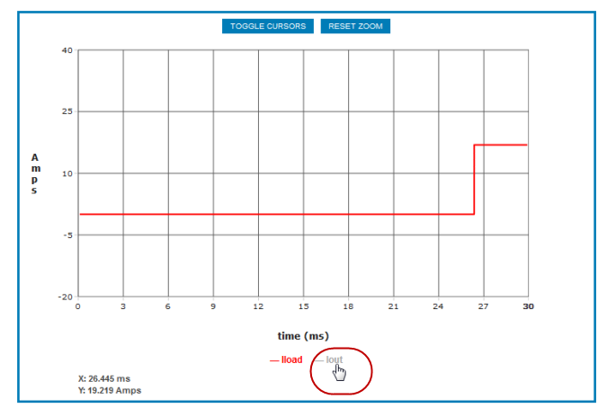 Waveform names are shown below the chart and waveforms can be turned on and off by clicking on the waveform names themselves. In the following example, Iload waveform is shown in red and Iout can be added by clicking on the waveform name: