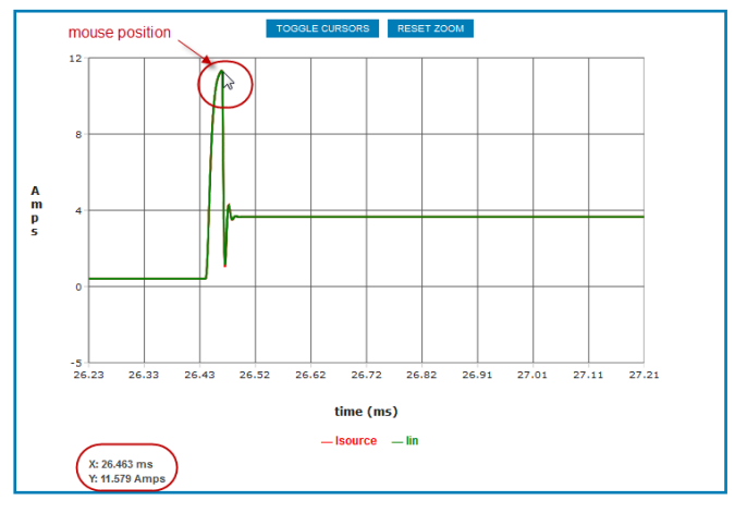 Moving the mouse along a wavform will cause an X,Y tip to show the X,Y value of the waveform at the pointer position. For example the pointer position in the following waveform is shown at the peak of the signal. The X and Y values corresponding to that position are shown below the waveform. In the example, the X value is 26.463ms after the start of the simulation and the Yvalue is 11.579 Amps. In this case, that is a convenient way of measuring peak Inrush Current.