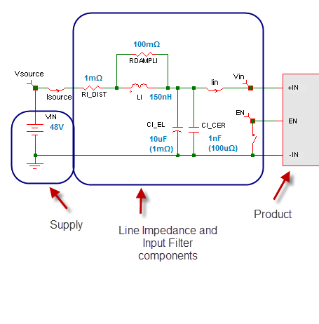 The Input section comprises of the Supply or Source as well as a set of components to represent Line Impedance, Input Filtering and Input Holdup Capacitance: