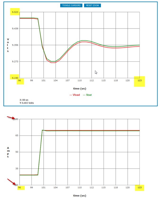 | Vin Step | To simulate an input transient by changing Vin from a starting value to an ending value at a user defined ramp-rate in V/us. The starting value can be greater than or less than the ending value. Either value can be inside or outside the operating range of the product. If either value is outside the operating range of the units, then the unit will behave accordingly. | Charts show Vin step, Iin change, Vout change and Iout change. |