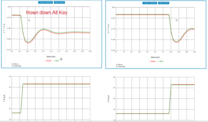 Following the efficiency/power loss and temperature table are the result waveforms. Typically the waveforms are shown in multiple charts with two or more waveforms per chart. Individually each chart can be selected by clicking anywhere on the chart.