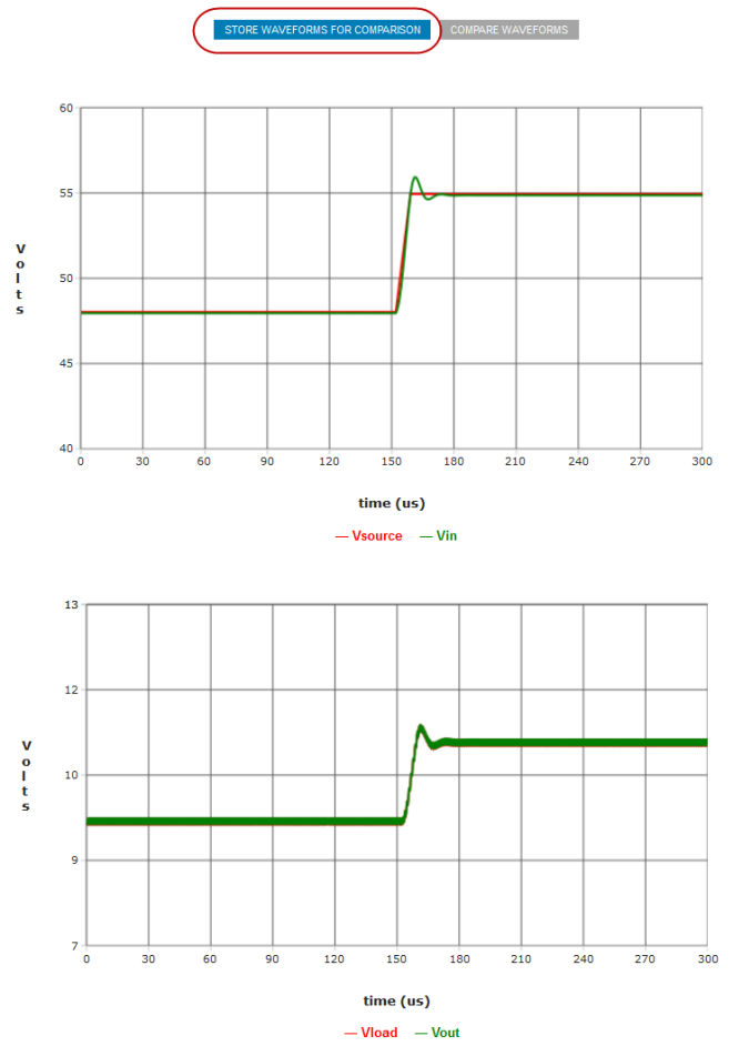 A Store and Compare capability is also made available in order to compare simulation results. For example, to understand the effect of an increased slew rate input volatge step and the output voltage response, the waveforms associated with the initial simulation can be super-imposed with the waveforms associated with the subsequent simulation.