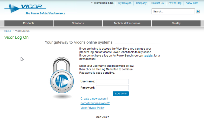 In order to save simulations, it is necessary to have an account and be logged on to the Vicor Design Center. If you are not already logged on, then the following logon screen is shown: