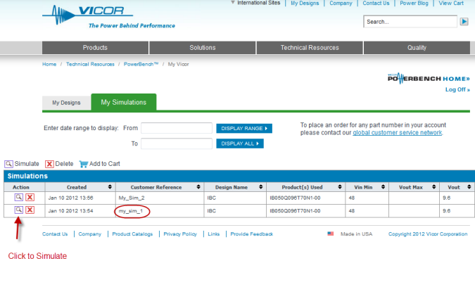 Under My Simulations is a list of all saved simulations, any of which can be recalled by clicking on the icon in the Action column.