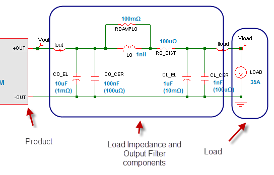 The Output section comprises of the Load as well as a set of components to represent Load Line Impedance, Output Filtering and Output Holdup Capacitance: