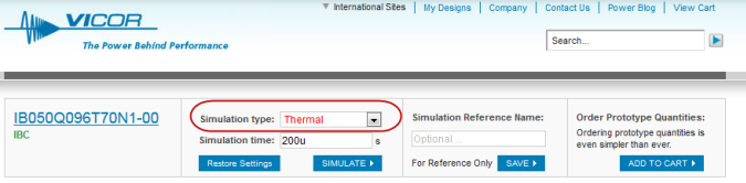 The Vicor On-Line Simulator provides a means to accurately simulate the electrical and thermal behavior of Vicor products. The user can define the operating and environmental conditions of the subject Vicor product. In addition to setting the basic Line and Load conditions, the user can also adjust input and output impedance and filters conditions. A variety of simulation types can be performed over a defined simulation period. Simulation result charts and tables accurately show product performance based on the user settings provided.